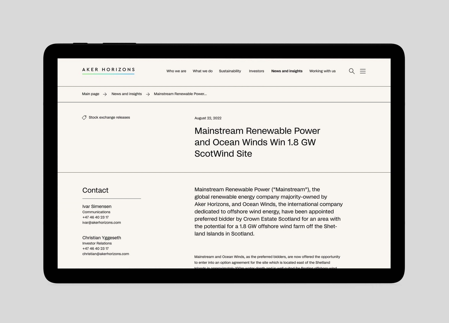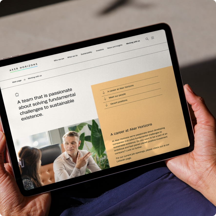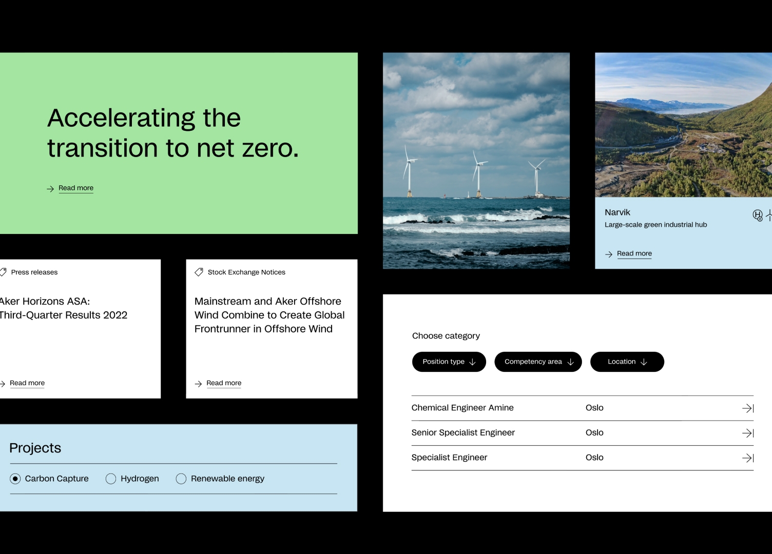 Aker Horizons akselererer skiftet til netto null ved å utvikle fornybar energi og grønn industri. De trengte en ny nettside for bedre å vise frem arbeidet og visjonen deres, samt dele informasjon om prosjekter med interessenter og aksjonærer. Formålet med å lansere ny nettside var å forbedre funksjonaliteten, storytelling samt legge grunnlaget for ny forretningsutvikling fra et Norsk investeringsselskap til en global utvikler av grønne industriprosjekter og teknologier.