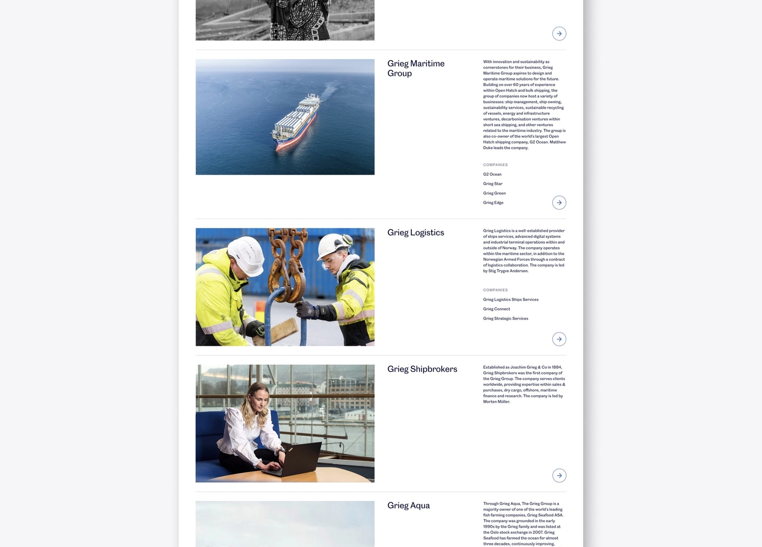 Sammen med Mission har vi bistått med å realisere Grieg-gruppens visjon om å samle alle selskaper under fanen “One Grieg Group”. Vi bygget en Wordpress Multisite løsning tilrettelagt for mange redaktører fra de ulike selskapene i konsernet. Et omfattende arbeid ble nedlagt for å kartlegge alle eksisterende nettsider, vurdere deres styrker og svakhet og ikke minst ta høyde for alle selskapenes behov og ambisjoner. På denne måten fikk vi og hver prosjektgruppe hos selskapene innsikt i hvordan vi kunne bruke nye nettsider mer aktivt for å inspirere og engasjere ulike målgrupper blant annet gjennom historiefortelling.